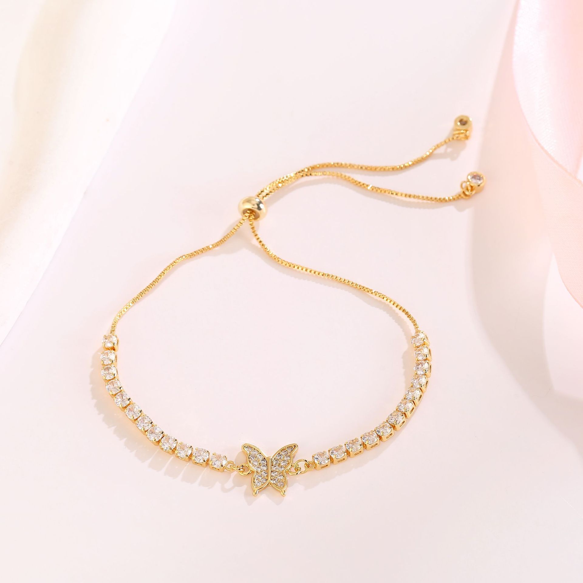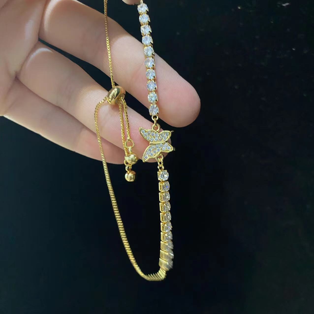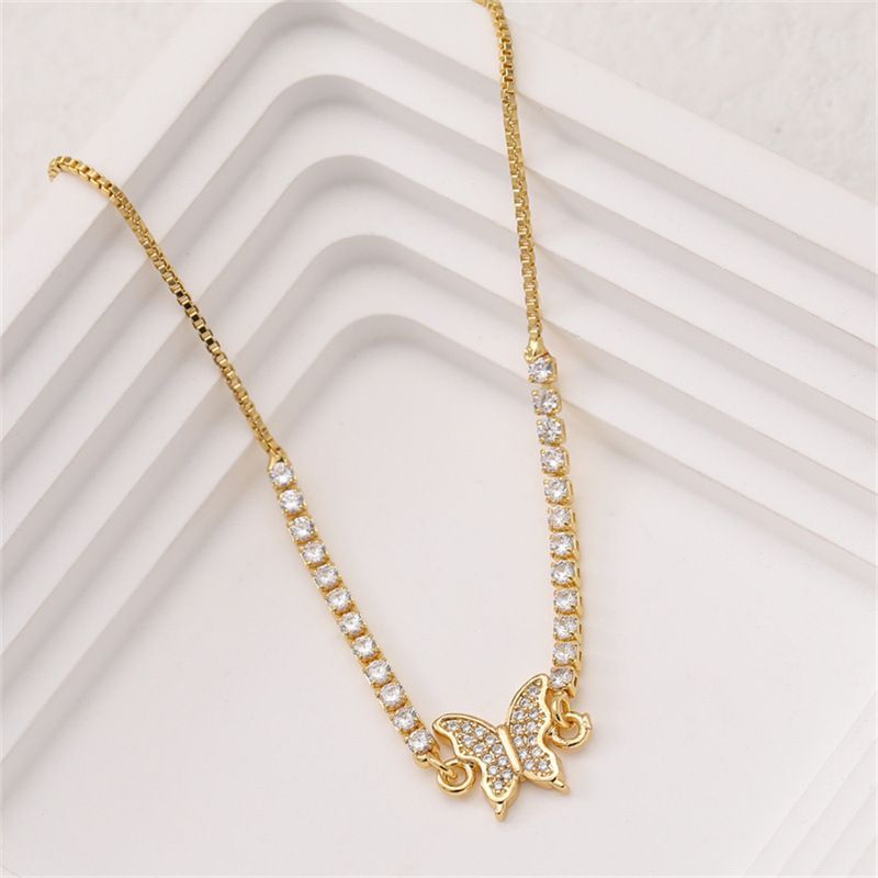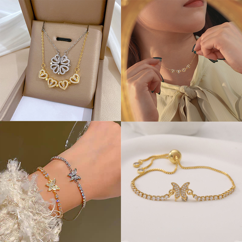 Set Vòng tay nữ Butterfly charm Bướm Vàng 18k đính đá + Dây chuyền Cỏ bốn lá trái tim đính đá